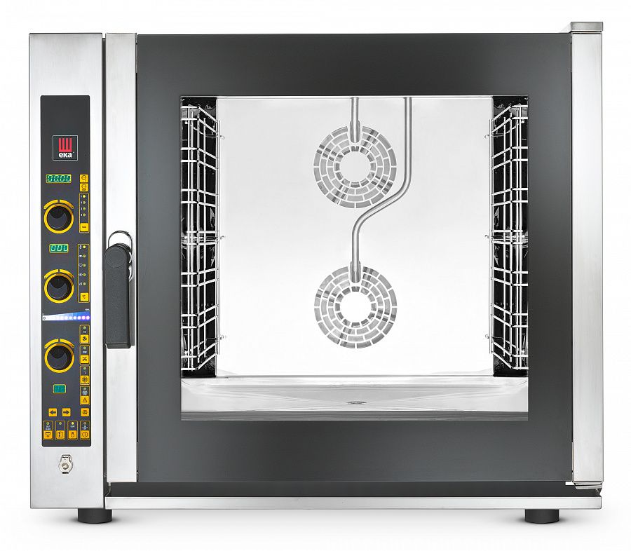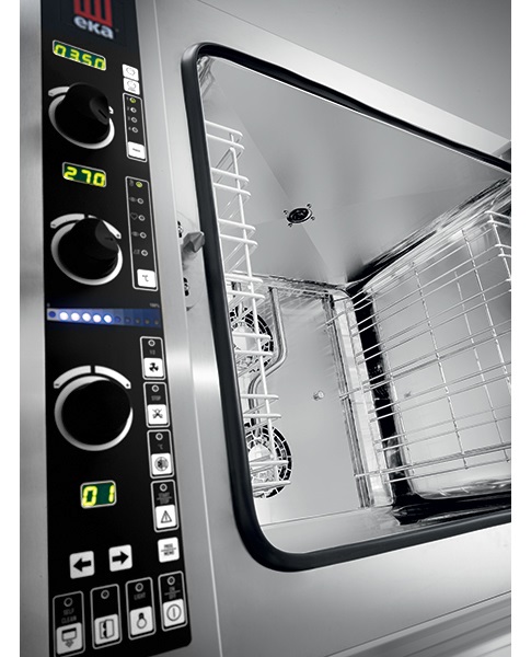 Прибор оснащен улучшенной панелью управления, снабженной 2 дисплеями, отражающими параметры температуры и времени, 4 светодиодами, сигнализирующими о выбранной фазе готовки, а также полосой визуализации климата, кнопкой установки функций и охлаждения рабочей камеры. Пароконвектомат предлагает несколько вариантов климата работы внутренней камеры: от «сухого» жара до режима максимальной влажности и наоборот. Внутренняя подсветка и широкое двойное термостойкое стекло в распашной двери позволяют наблюдать за процессом приготовления блюда без необходимости открытия дверцы.
