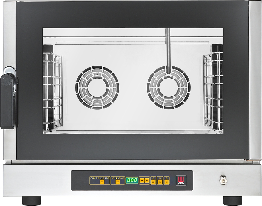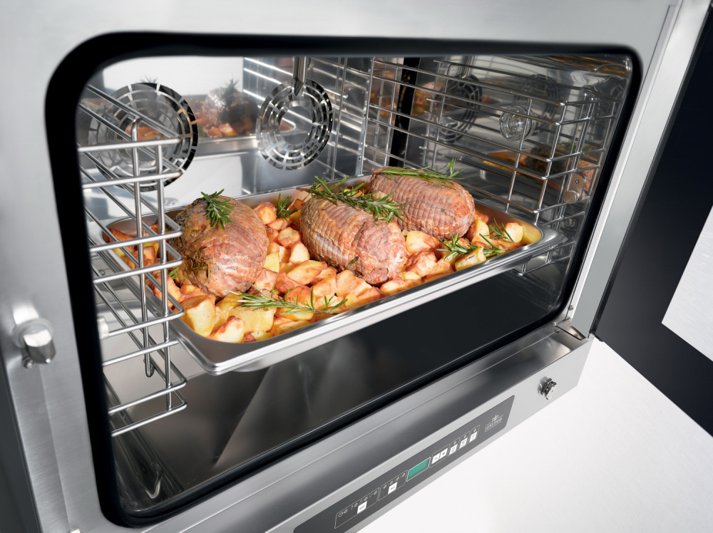 Прибор оснащен улучшенной цифровой панелью управления, снабженной дисплеем, отражающим параметры температуры и времени и 4 светодиодами, сигнализирующими о выбранной фазе готовки. Пароконвектомат предлагает несколько вариантов климата работы внутренней камеры: от «сухого» жара до режима максимальной влажности и наоборот. Внутренняя подсветка и широкое двойное термостойкое стекло в распашной двери позволяют наблюдать за процессом приготовления блюда без необходимости открытия дверцы.